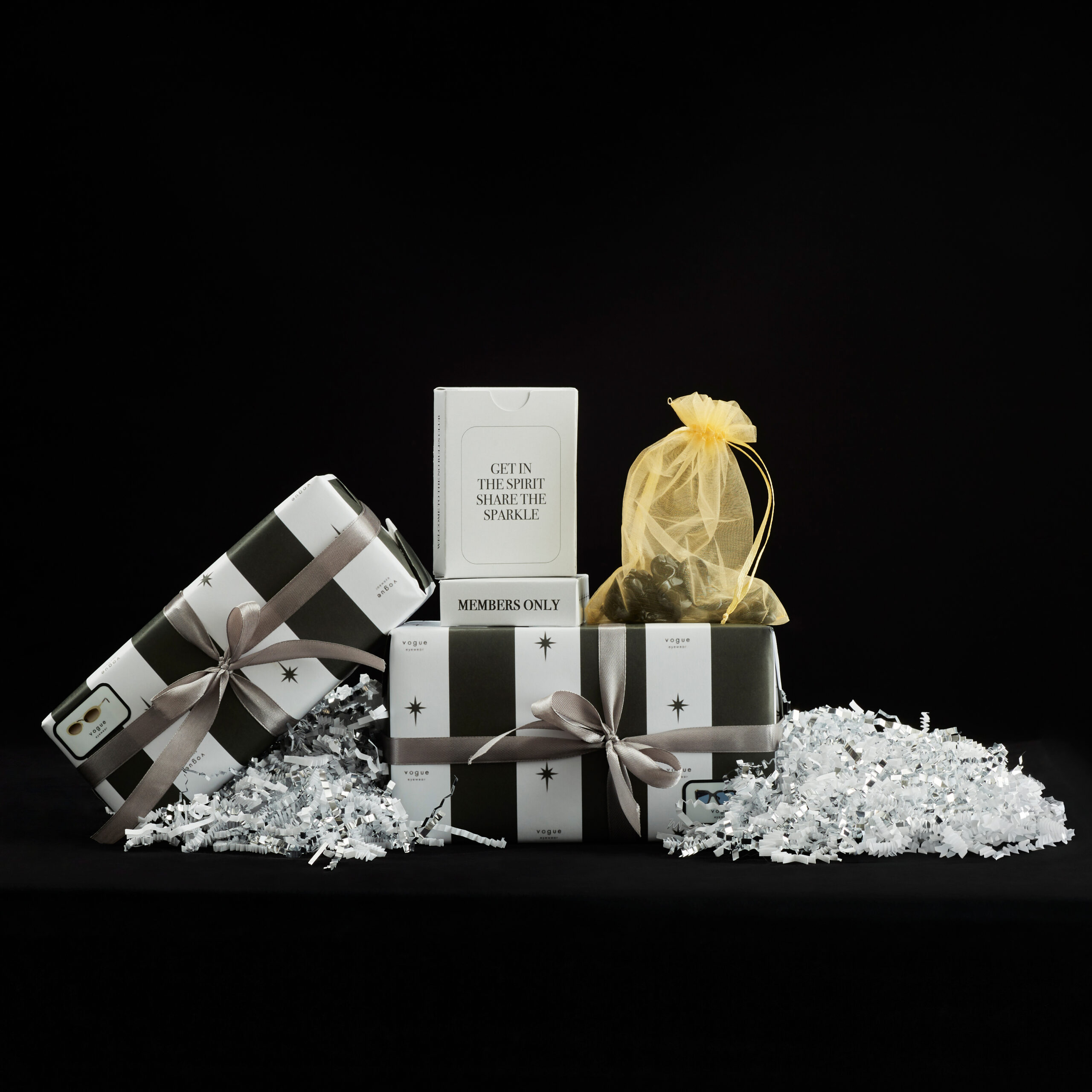 The Gift of Regifting Mailer! To help generate traffic around the new Vogue Eyewear holiday line, we built an experience that created excitement for recipients and encouraged sharing in the season of giving. Each mailer included two pairs of sunglasses: 1 to keep and 1 to gift. This concept was prompted by the client's desire to show togetherness and friendship during the holidays. We prioritized branded moments at each stage of the unboxing, such as custom branded wrapping paper and shipper tape, to allow recipients to take in the moment with Vogue Eyewear. Sunglasses were wrapped in custom paper and were accompanied by an acrylic glasses chain, a custom deck of Vogue Eyewear playing cards, and a notecard insert.