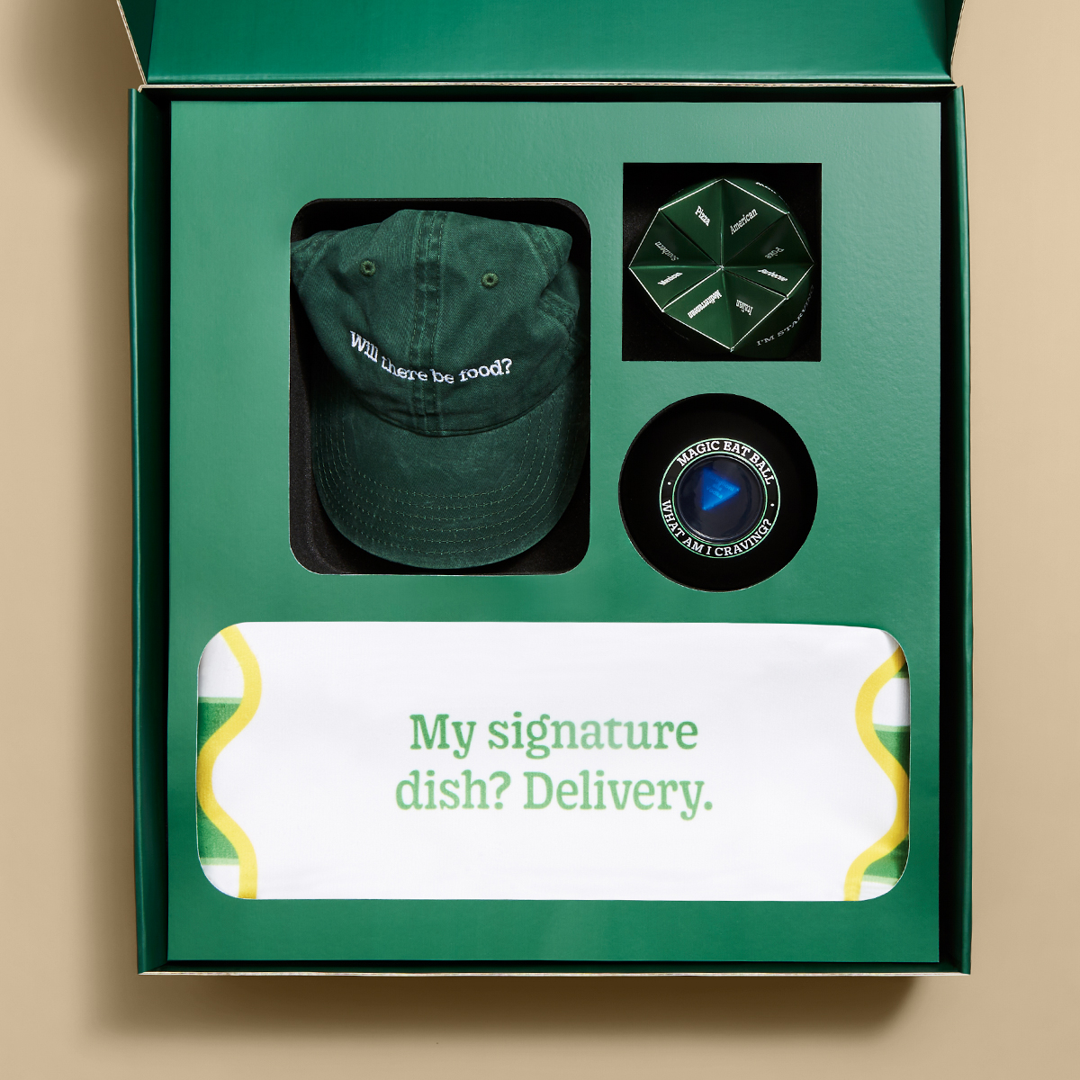 Packages includes a 90s-themed fortune teller to play with a partner. We also made a custom magic eight ball, rebranded as a Magic Eat Ball, featuring 20 different food options for folks to shake and find out. A branded hat and dish towel were the final pieces of the package, along with a informational postcard. Each mailer was shipped with branded tape for immediate brand recognition.